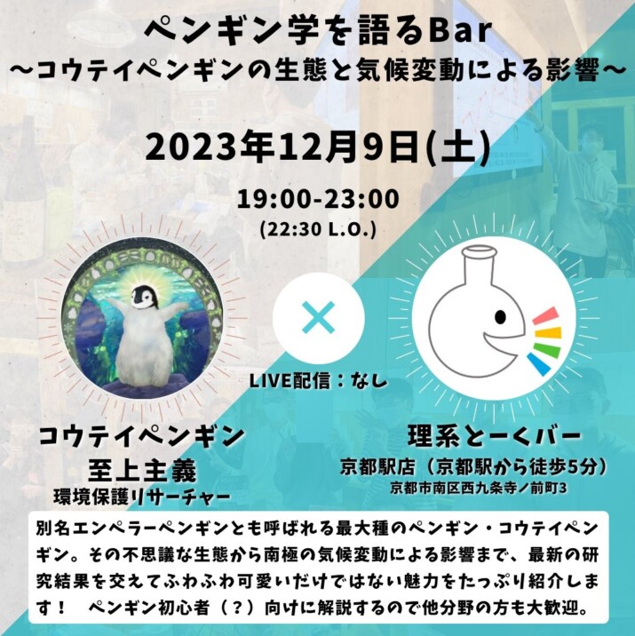 次回ワークショップが開催が決定しました! ペンギン学を語るBar 〜コウテイペンギンの生態と気候変動による影響〜 日時:2023年12月9日(土)19:00〜23:00 場所:理系とーくバー 京都駅店(https://rikei-talk.com/bar/) ※京都駅から徒歩5分 内容:別名エンペラーペンギンとも呼ばれる最大種のペンギン・コウテイペンギン。その不思議な生態から南極の気候変動による影響まで、最新の研究結果を交えてふわふわ可愛いだけではない魅力をたっぷり紹介します!ペンギン初心者(?)向けに解説するので、他分野の方も大歓迎。 関西にお住いの方はぜひいらしてください!